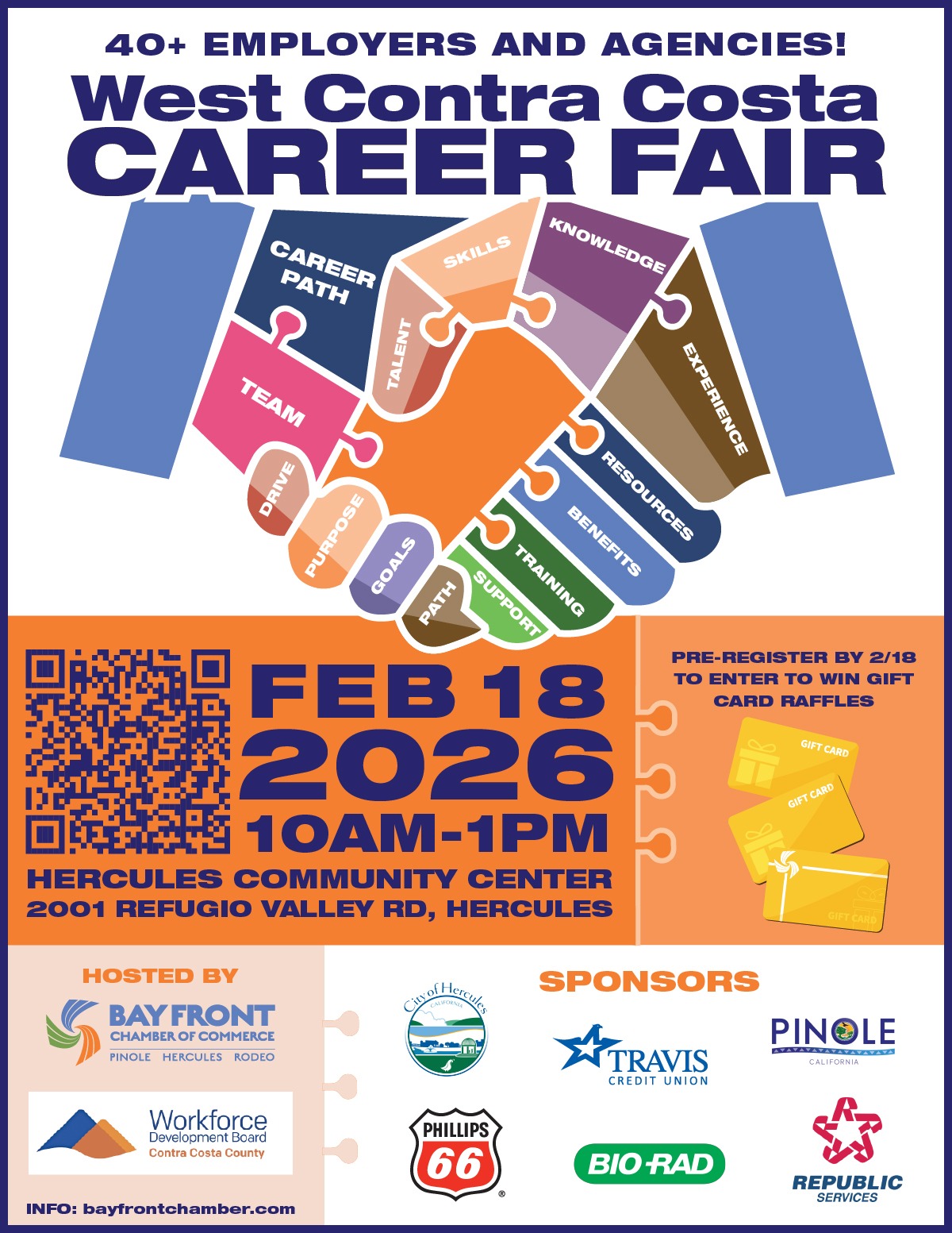 The Bay Front Chamber of Commerce in partnership with the Workforce Development Board of Contra Costa County is bringing together top employers from various industries. Network with like-minded individuals and discover exciting job prospects. Whether you’re a seasoned professional or just starting out, this event is perfect for anyone looking to explore new job opportunities or advance their career.