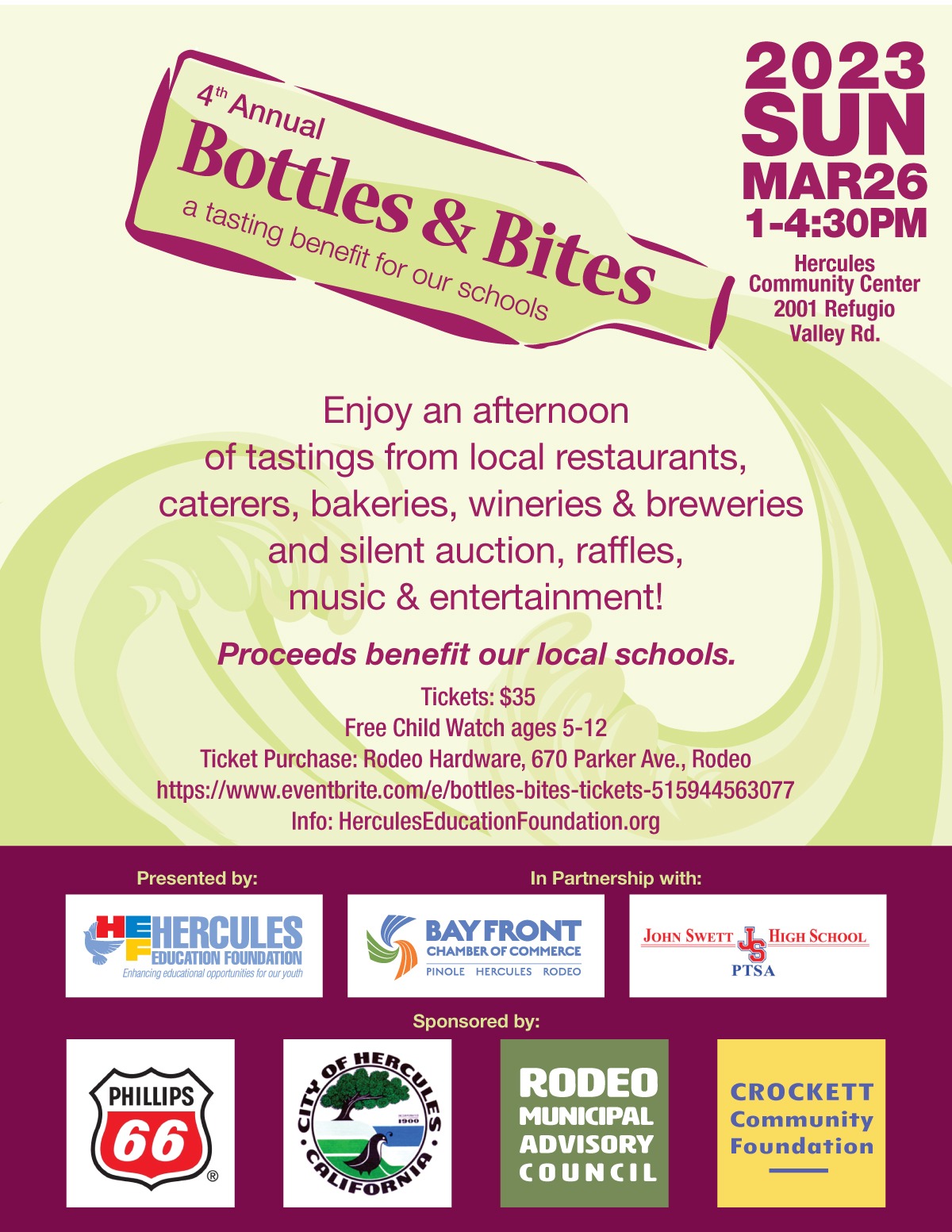 march, 2023 Bottles & Bites Hercules Community Center 2001 Refugio Valley Rd. 202326mar1:00 pm4:30 pmBottles & BitesA TASTING BENEFIT FOR OUR SCHOOLS1:00 pm - 4:30 pm Hercules Community Center, 2001 Refugio Valley Rd. Time (Sunday) 1:00 pm - 4:30 pm LocationHercules Community Center2001 Refugio Valley Rd. Organizer HERCULES EDUCATION FOUNDATION510-685-1182 CalendarGoogleCal Leave A Comment Cancel replyComment Please enter an answer in digits:thirteen − eleven =