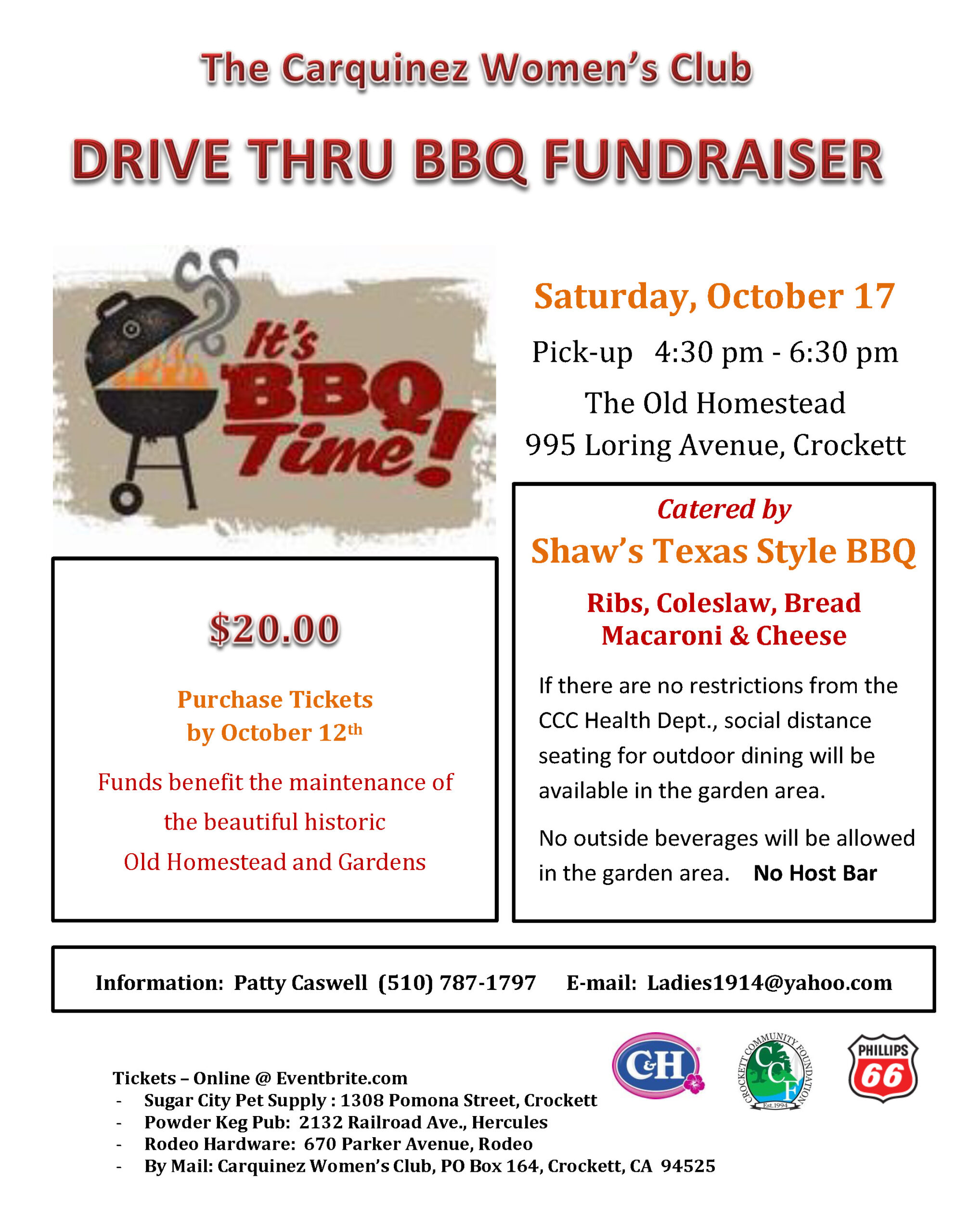 202017oct4:30 pm6:30 pmCWC BBQ DRIVE THRU FUNDRAISERCATERED BY SHAWS TEXAS STYLE BBQ4:30 pm - 6:30 pm THE OLD HOMESTEAD, Loring Ave., Crockett