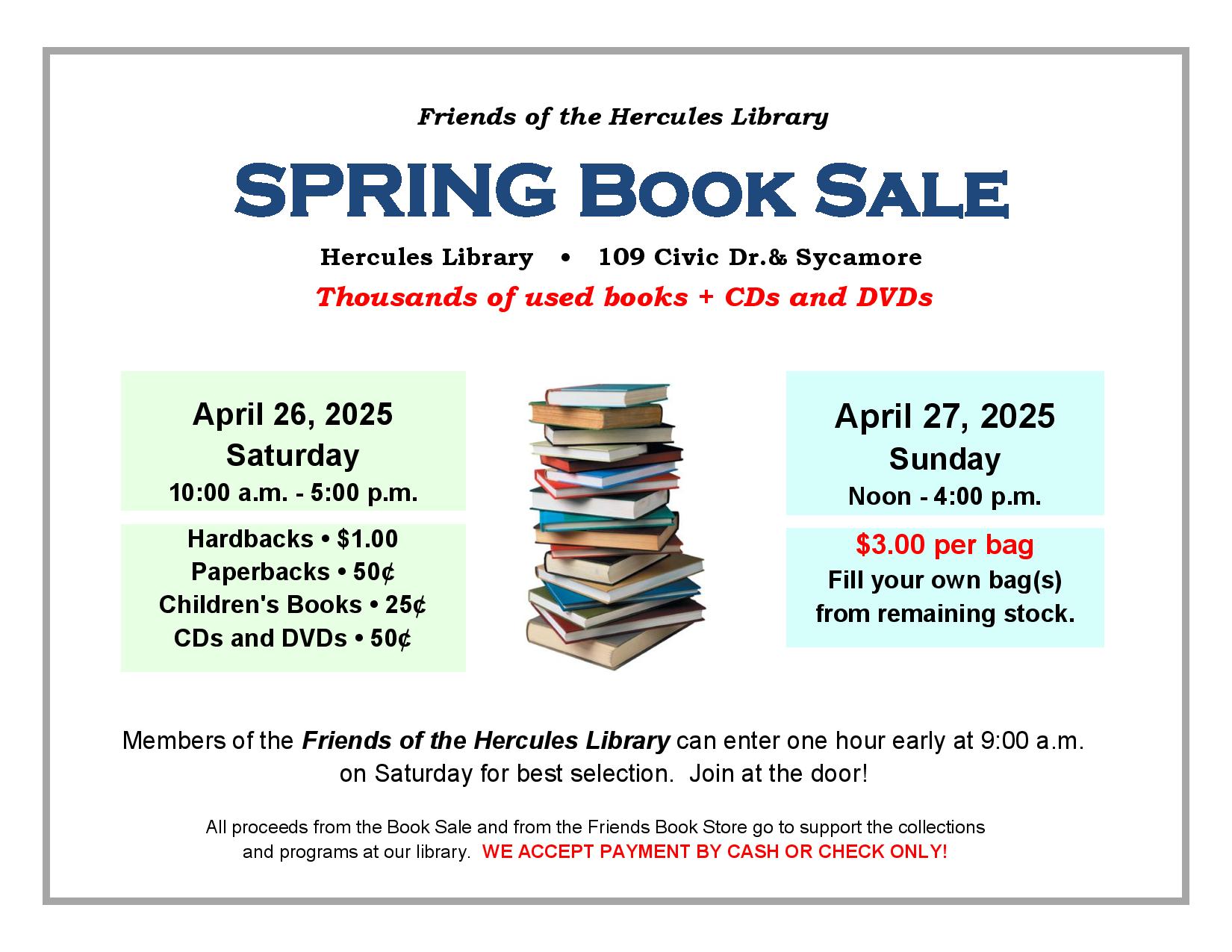 april, 2025 Friends of the Hercules Library Spring Book Sale Hercules Library 109 Civic Drive 202526apr10:00 am5:00 pmFriends of the Hercules Library Spring Book Sale10:00 am - 5:00 pm Hercules Library, 109 Civic Drive Time (Saturday) 10:00 am - 5:00 pm LocationHercules Library109 Civic Drive CalendarGoogleCal Leave A Comment Cancel replyComment Please enter an answer in digits:4 × 3 =
