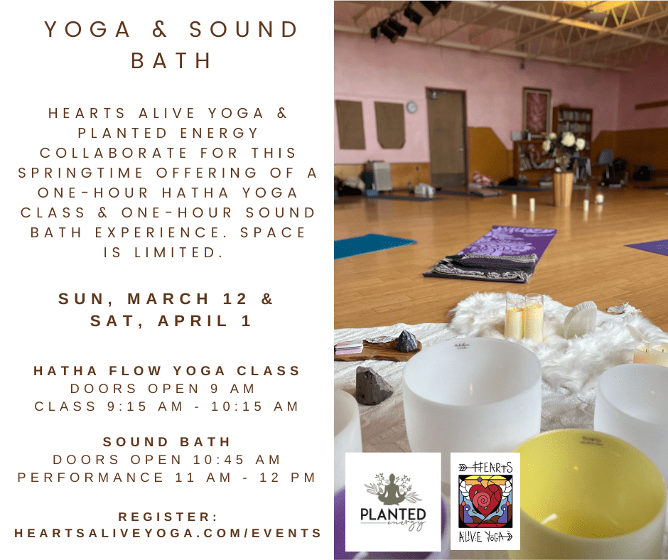 Hearts Alive Yoga is collaborating with Nicole Reyes of Planted Energy this spring, offering a one-hour hatha flow yoga class followed by a sound bath performance. Space is limited. About: