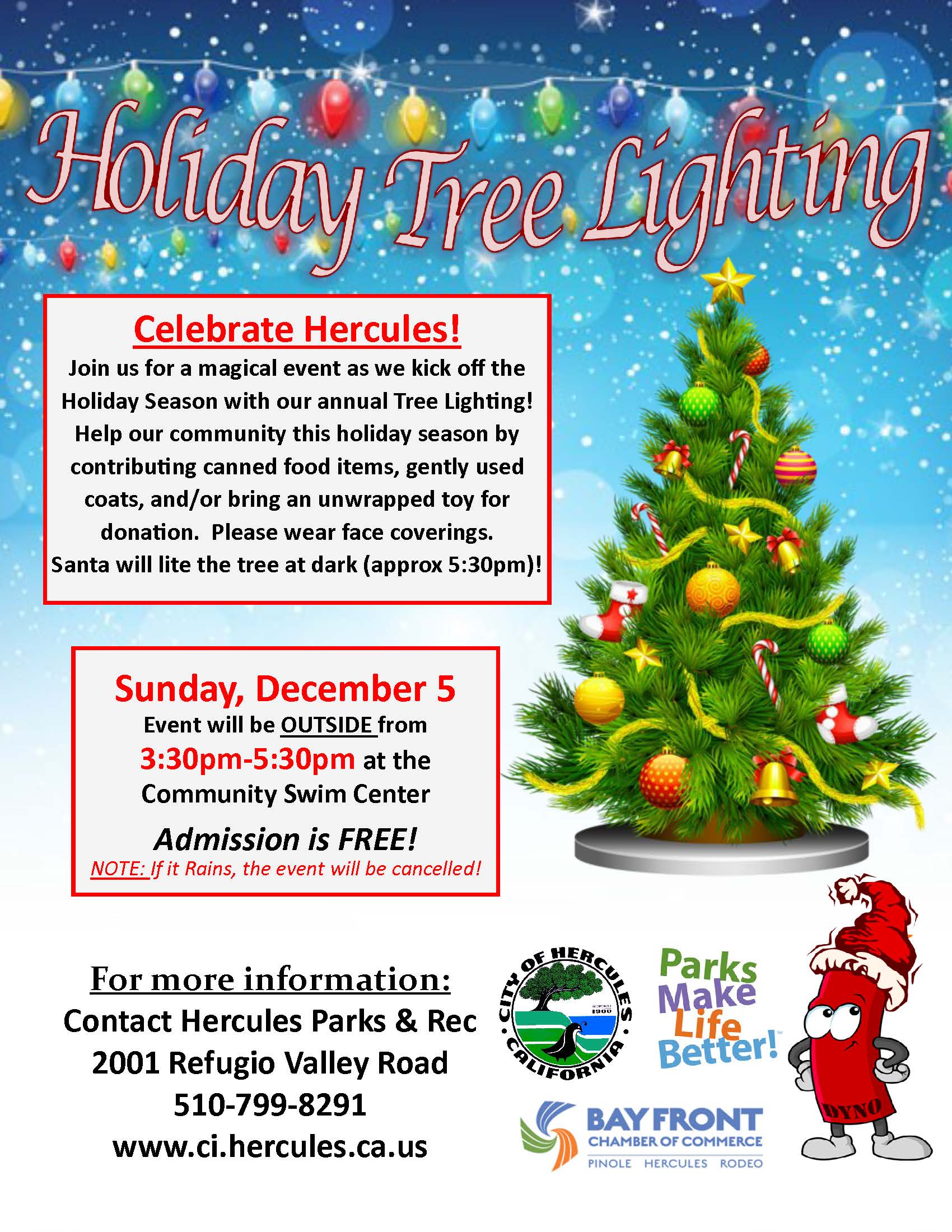 Santa will arrive at 3:45 and you’ll have the opportunity to take pictures with him and Mrs. Clause. Santa will light the tree at the end of the event, at approximately 5:30pm.