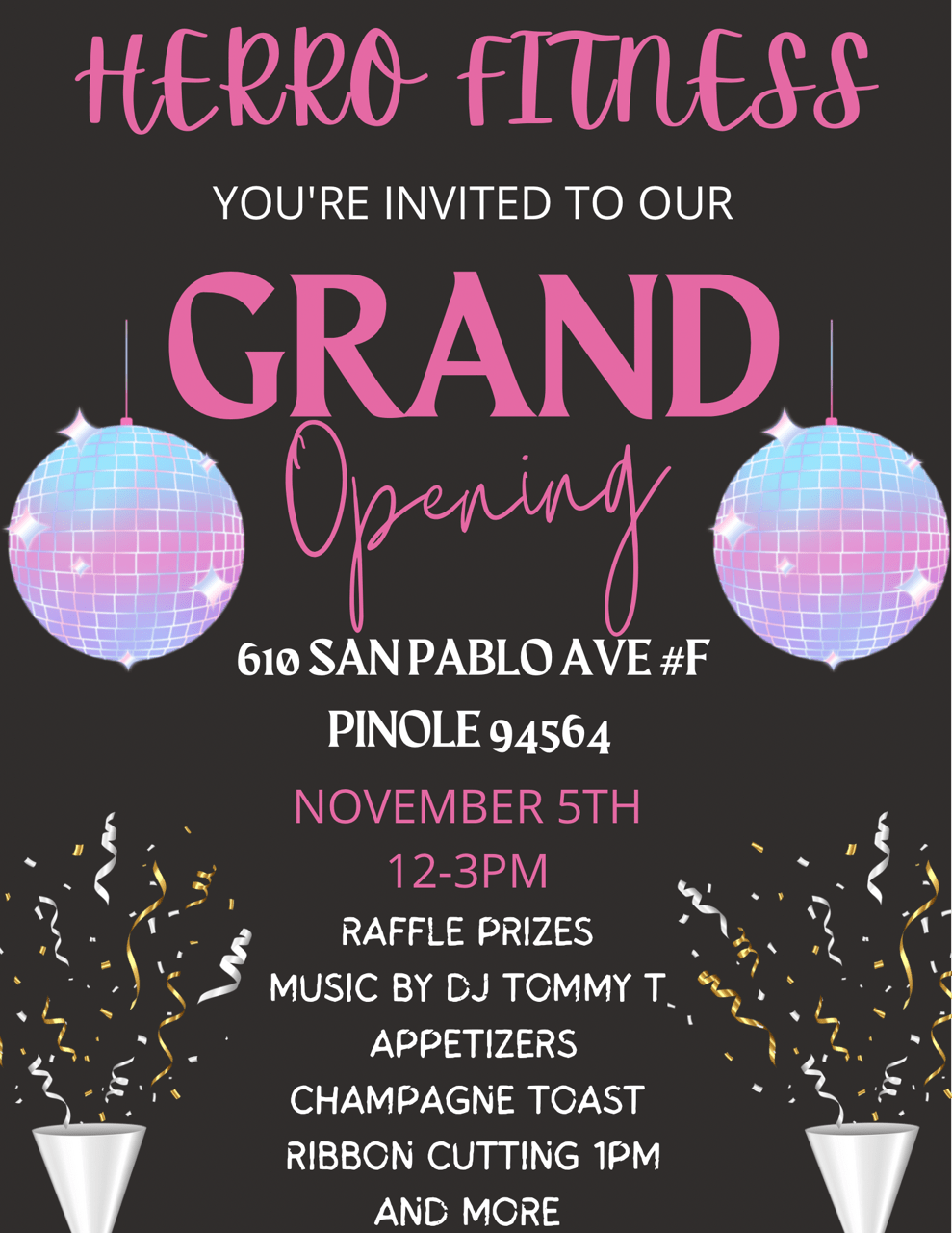 november, 2023 HERRO FITNESS GRAND OPENING HERRO FITNESS 610 SAN PABLO AVE., PINOLE 202305nov12:00 pm3:00 pmHERRO FITNESS GRAND OPENINGRIBBON CUTTING @ 1:00 PM12:00 pm - 3:00 pm HERRO FITNESS, 610 SAN PABLO AVE., PINOLE Event DetailsJoin us to celebrate our Grand Opening and Ribbon Cutting. Event Details Join us to celebrate our Grand Opening and Ribbon Cutting. Time (Sunday) 12:00 pm - 3:00 pm LocationHERRO FITNESS610 SAN PABLO AVE., PINOLE CalendarGoogleCal Leave A Comment Cancel replyComment Please enter an answer in digits:eleven + 12 =