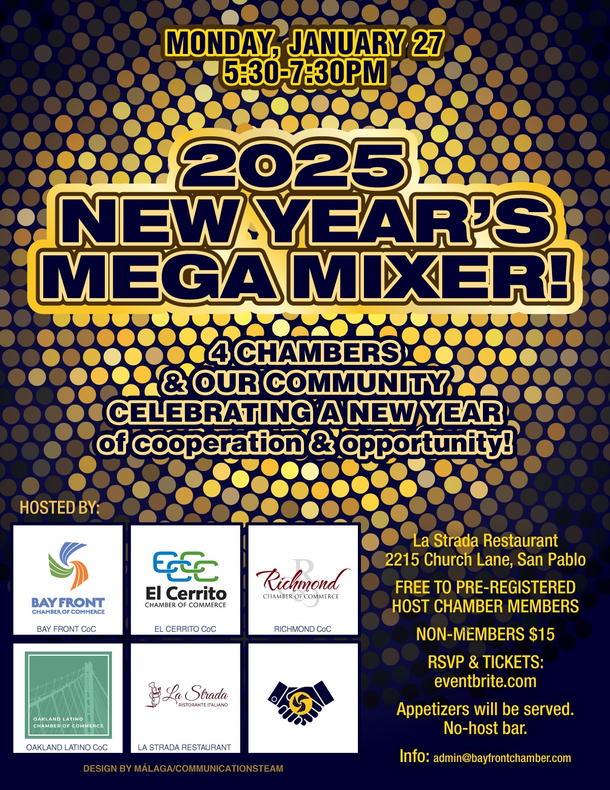 202527jan5:30 pm7:30 pmNEW YEAR MEGA MIXERALL MEMBERS OF THE BUSINESS COMMUNITY ARE WELCOME5:30 pm - 7:30 pm La Strada, 2215 Church Lane, San Pablo