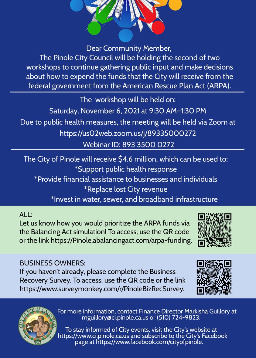 Workshop via Zoom The City of Pinole will receive 4.6 million from the federal appointment. The Pinole City Council is seeking public input about how to expend the funds. Business Owners: Complete