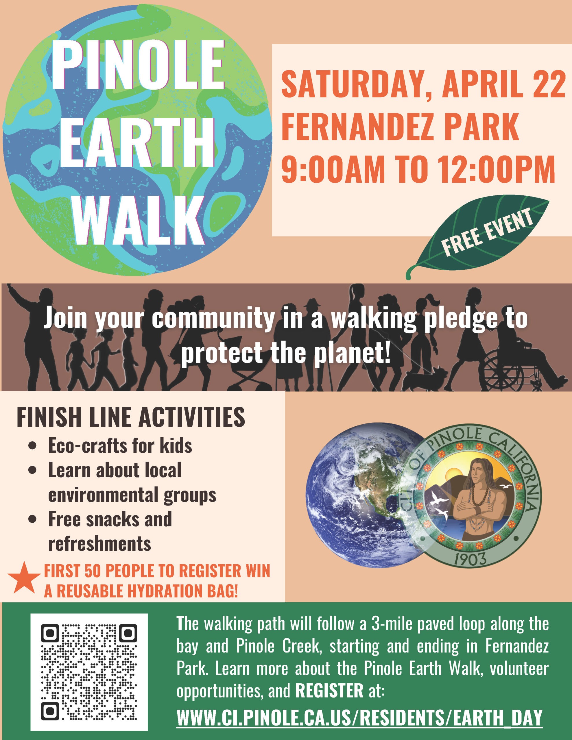 202322apr9:00 am12:00 pmPINOLE EARTH WALKjOIN YOUR COMMUNITY IN A WALKING PLEDGE TO PROTECT THE PLANET9:00 am - 12:00 pm FERNANDEZ PARK, 595 Tennent Ave., Pinole
