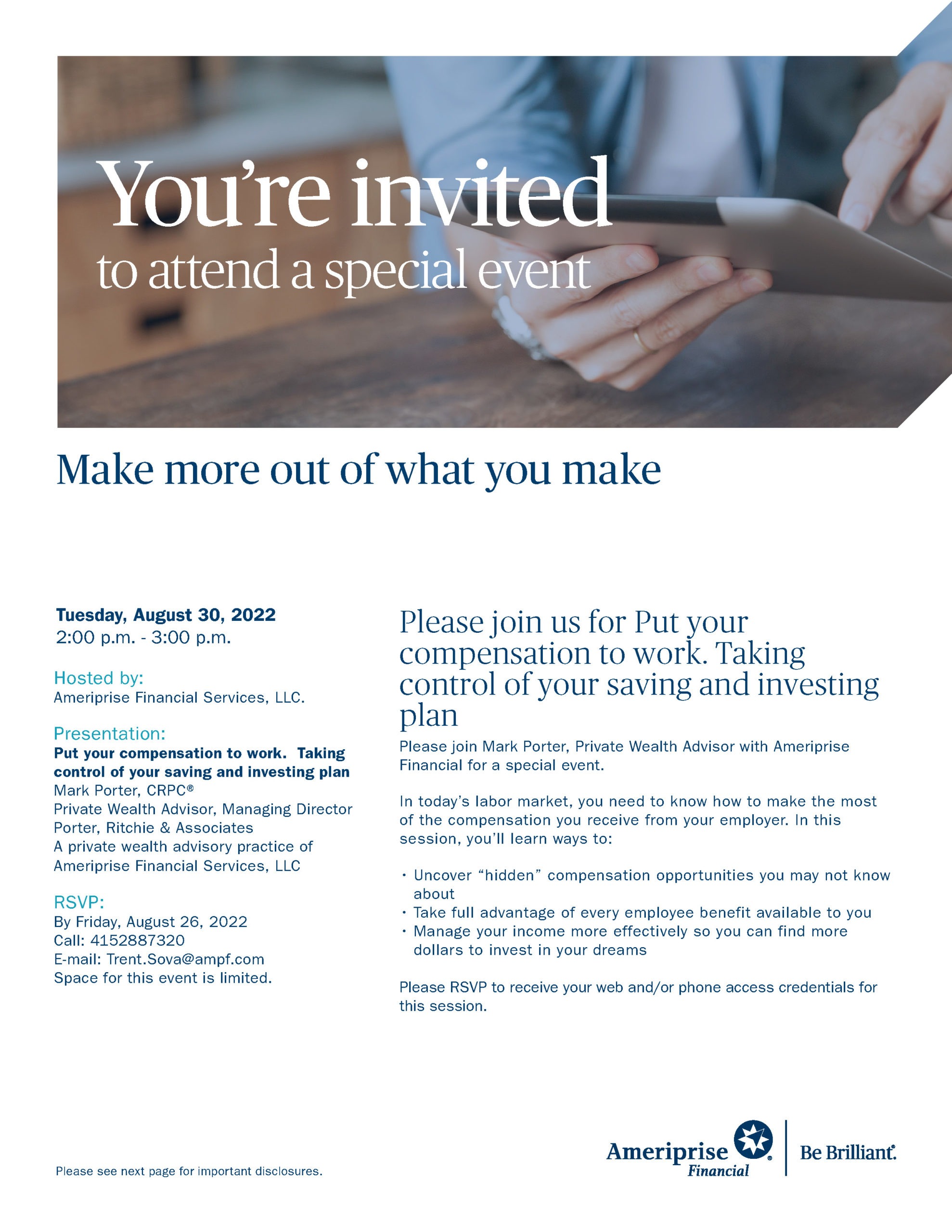 - Uncover hidden compensation - Take full advantage of every employee benefit available to you - Manage your income more efficiently so you can find more dollars to invest in your dreams RSVP