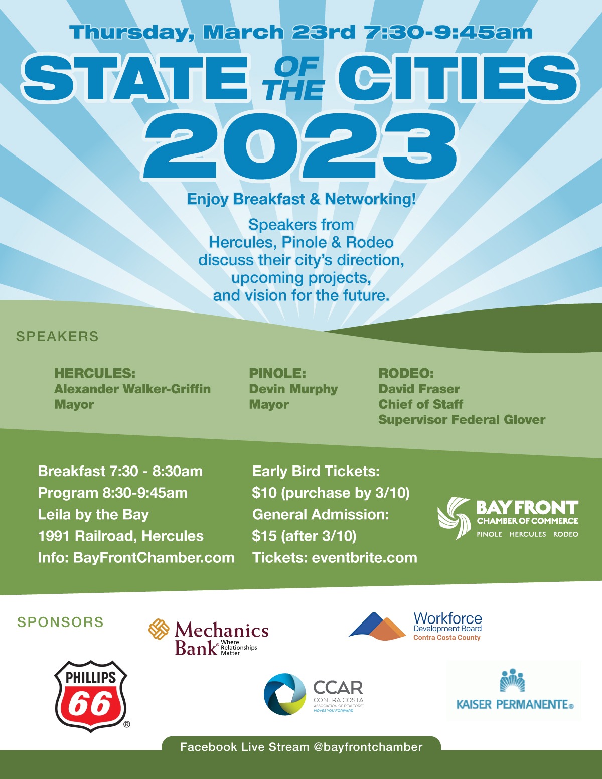 ENJOY BREAKFAST & NETWORKING! SPEAKERS: Hercules - Alexander Walker-Griffin, Mayor Pinole - Devin Murphy, Mayor Rodeo - David Fraser, Chief of Staff for Supervisor Federal Glover THANK YOU SPONSORS PHILLIPS 66 ~