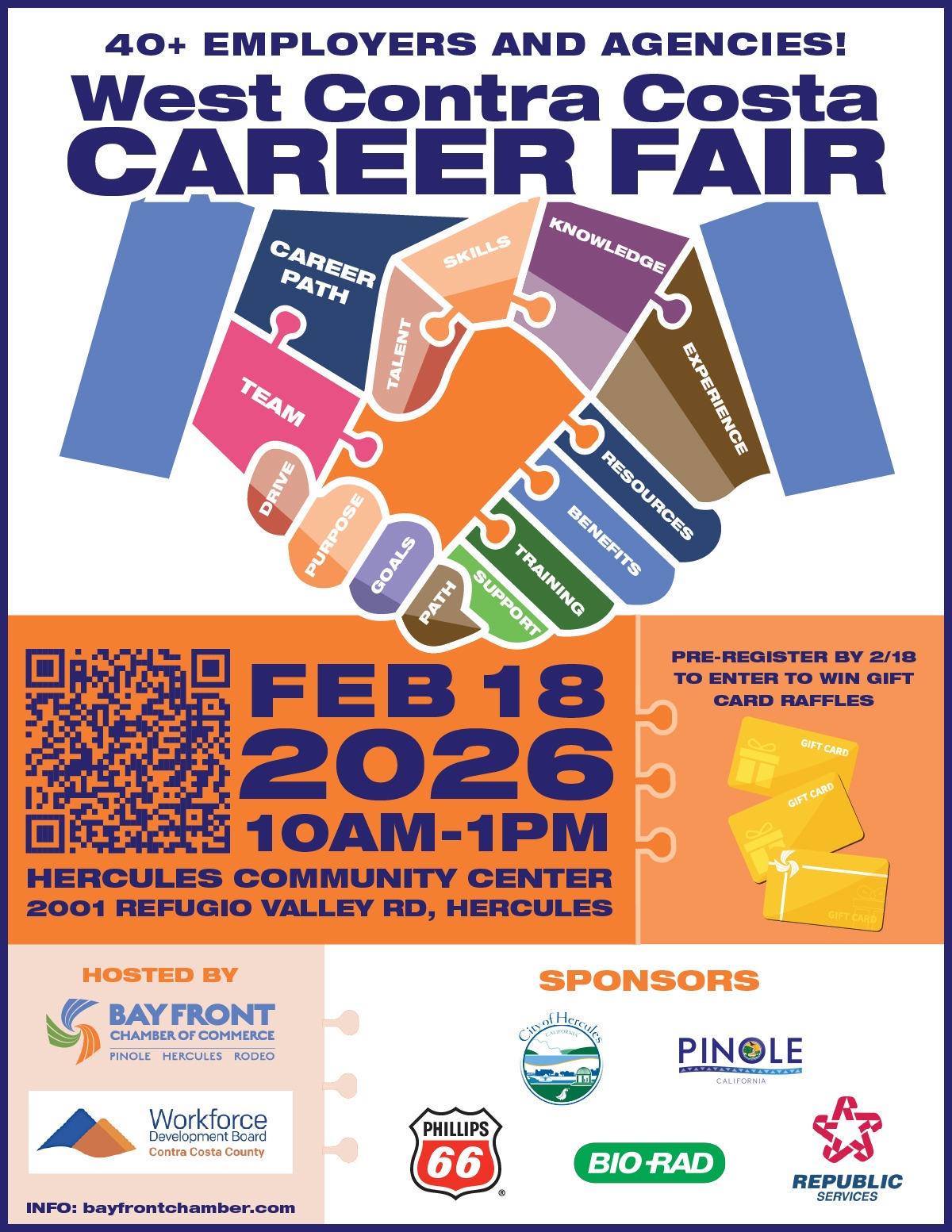 202618feb(feb 18)10:00 am19(feb 19)1:00 pmWEST CONTRA COSTA CAREER FAIRMeet 40 Employers & Resource Organizations10:00 am - 1:00 pm (19) Hercules Community Center, 2001 Refugio Valley Rd.